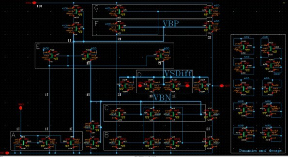 Токовые зеркала на р-канальных транзисторах находятся под общим потенциалом напряжения питания (AVDD). Подложка дифференциальной пары подведена к соединению VSDiff, поэтому фиктивные элементы также подключены к этому узлу.