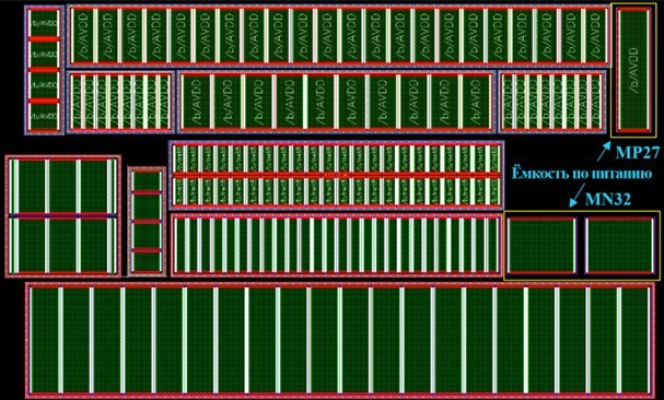 По краям массивов транзисторов расположены фиктивные элементы. Они служат для обеспечения идентичности окружения у транзисторов, находящихся на периферии согласованной группы [5]. Также добавление фиктивных транзисторов p-типа позволяет уменьшить влияние эффекта близости края кармана n-типа (well proximity effect – WPE [6]).