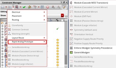 После выбора режима Constraints появляется окно управления ограничениями (Constraint Manager) c панелью инструментов, позволяющей создать массивы согласованных элементов. Меню управления ограничениями имеет в своем функционале уже готовые прототипы для базовых структур схемы (инструмент Rapid Analog Prototype).